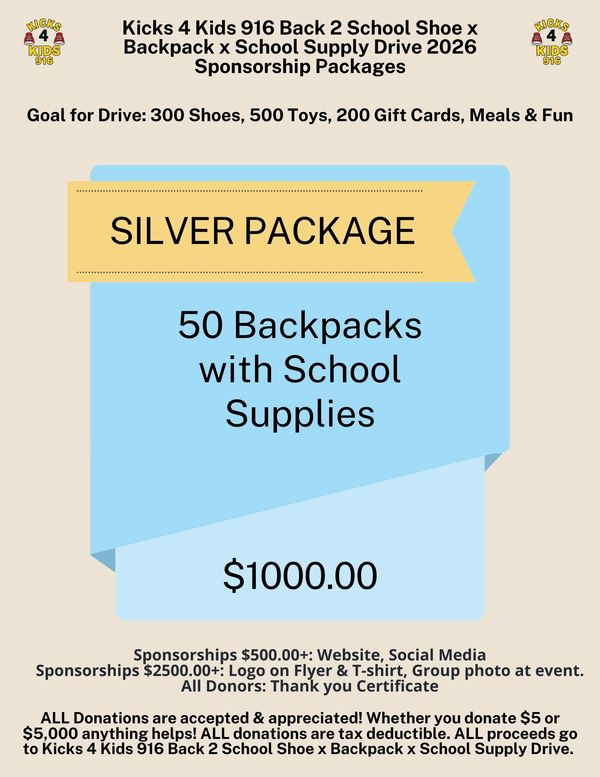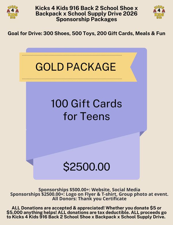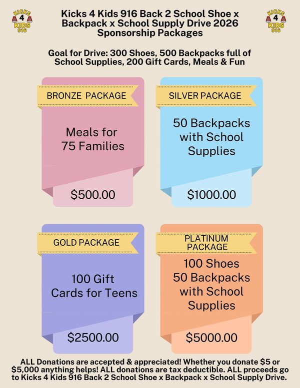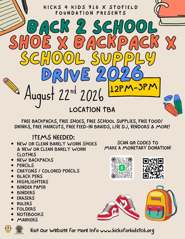 Saturday August 22nd, 2026 Kicks 4 Kids 916 x Stofield Foundation Presents: "Kicks 4 Kids Back 2 School Shoe x Backpack x School Supply Drive" from 12PM-3PM.