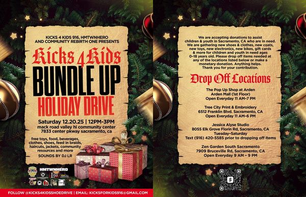 Saturday December 20th, 2025 Kicks 4 Kids 916 x HMTWNHERO And Community Rebirth One Presents: "Kicks 4 Kids Bundle Up Holiday Drive" from 12PM-3PM.